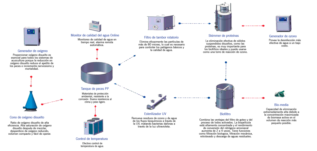 Un sistema RAS es una instalación cerrada donde el agua se filtra, oxigena y reutiliza continuamente, creando un entorno óptimo para el crecimiento de especies acuáticas. A diferencia de los métodos tradicionales, no depende de cuerpos de agua naturales ni de grandes extensiones de terreno.